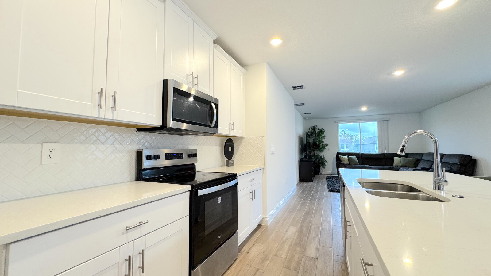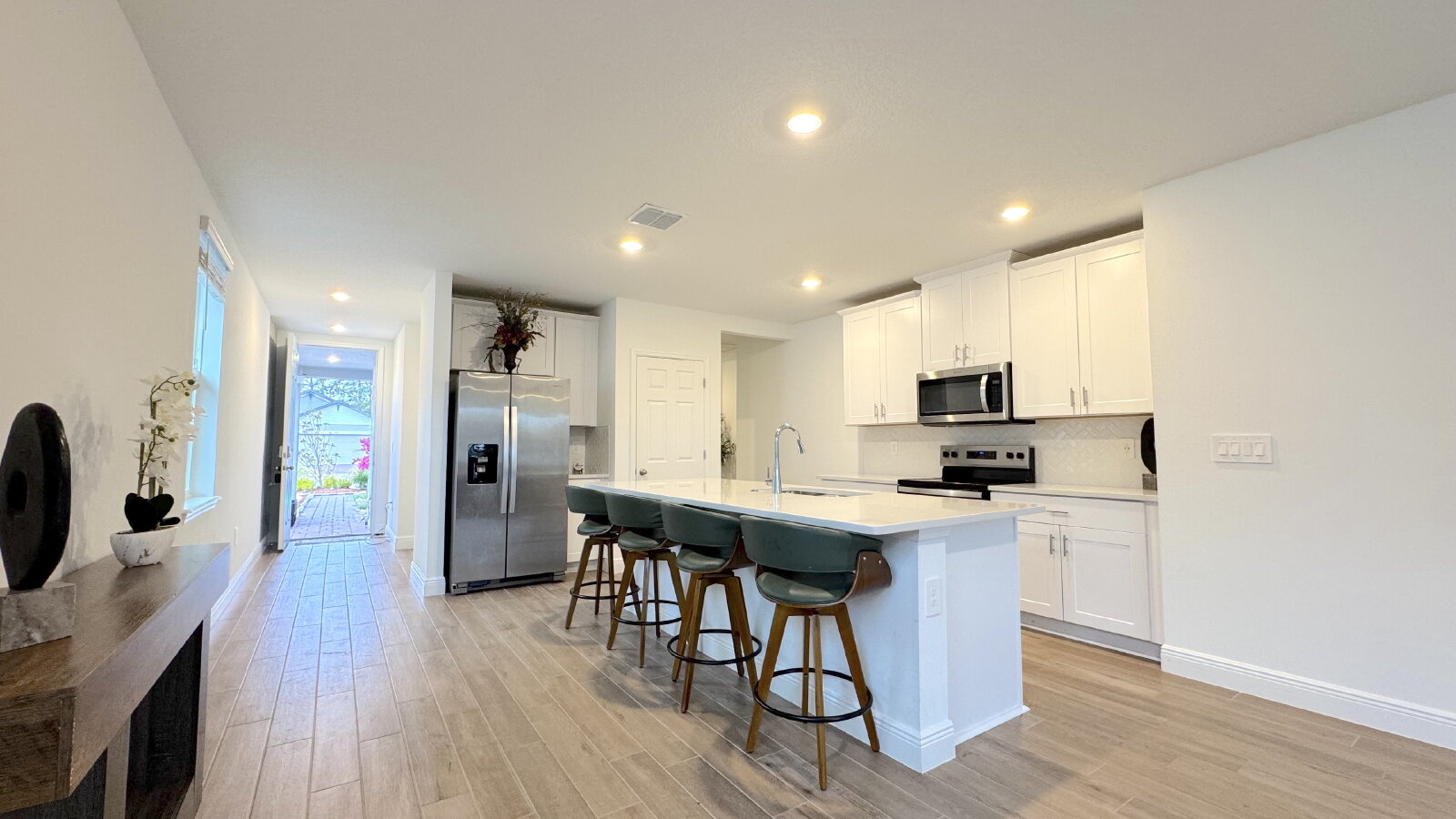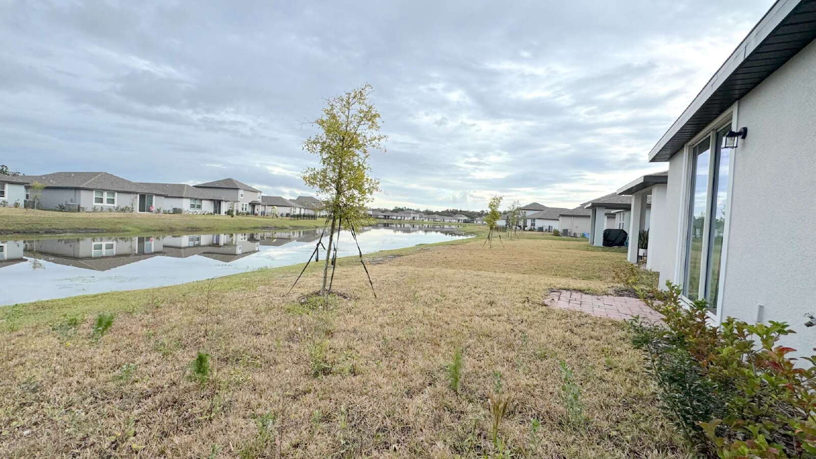 Step into this bright and spacious home with modern finishes and an all-white gourmet kitchen. Beautiful custom landscaping and water feature welcome you in the front of the house. This home offers a large great room, tall ceilings, a kitchen island with space for 4 barstools, large walk-in pantry, 2-car garage, and a lovely view of the pond in the backyard. The master bedroom boasts a large ensuite bathroom with a walk-in tiled shower and walk-in closet. This house is located in a safe, quiet neighborhood right down the street from the LPGA International Golf Course. Don't miss your chance to call this beautiful house your home! Furniture not included.
