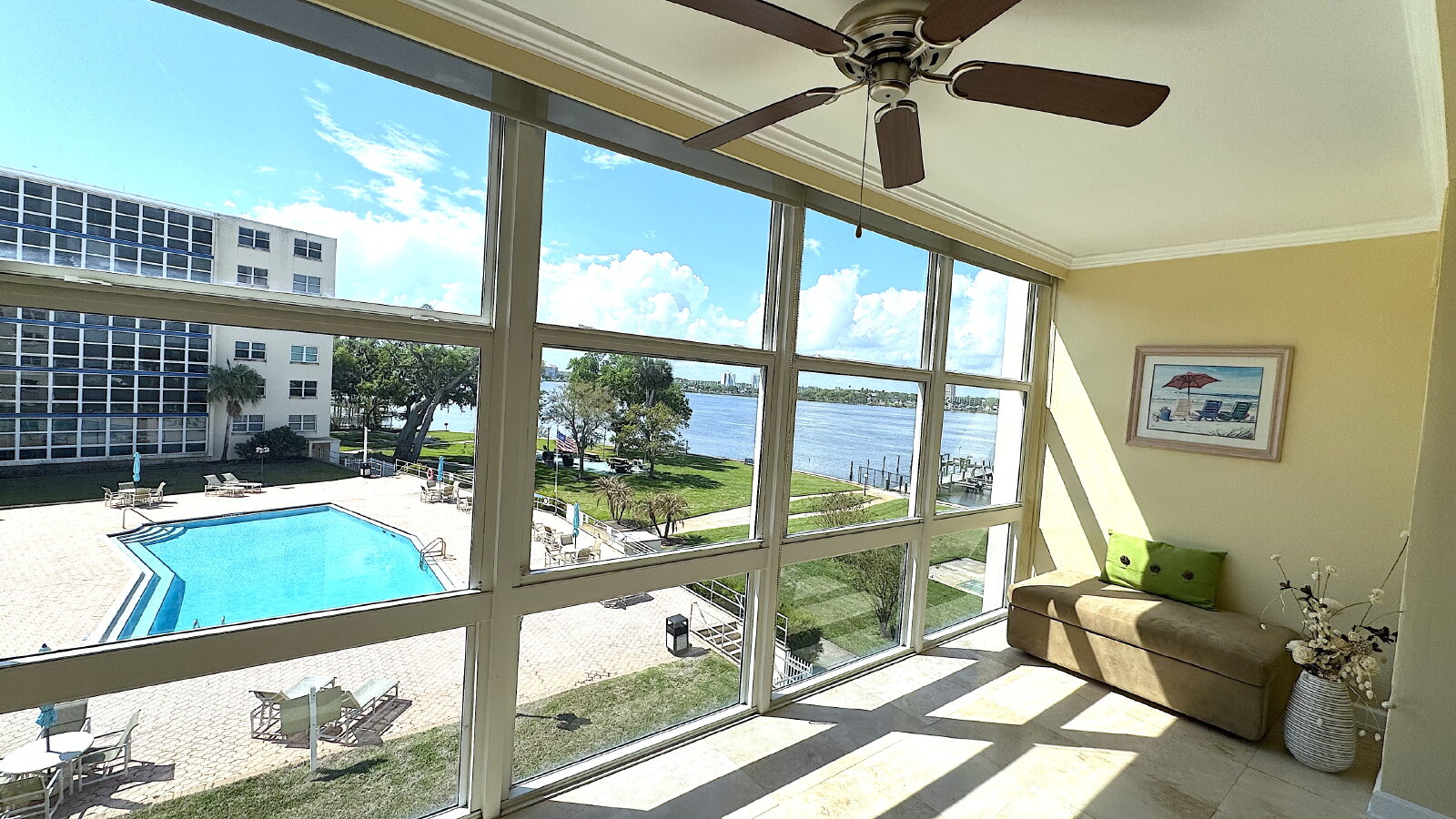 Enjoy coastal living in this beautifully maintained, fully furnished 2-bedroom, 2-bath condo for rent in Daytona Beach, Florida. This bright and spacious unit offers an open-concept layout with plenty of natural light, a fully equipped kitchen, and comfortable living and dining areas perfect for relaxing or entertaining. Step into the inviting sunroom and take in serene views overlooking the sparkling pool and the tranquil river—an ideal setting for morning coffee or evening sunsets. The primary suite features ample closet space and an en-suite bathroom, while the second bedroom and full bath provide flexibility for guests or a home office. Tastefully furnished throughout, this condo is move-in ready and designed for easy, comfortable living. Conveniently located near shopping, dining, and the beach, it combines comfort, convenience, and scenic beauty in one perfect rental opportunity.